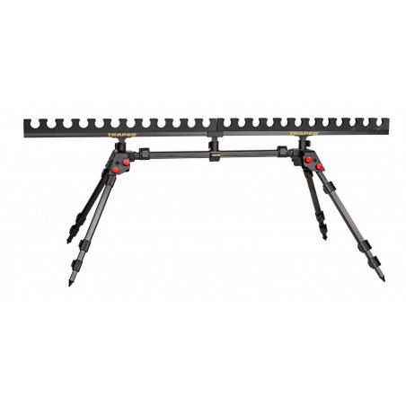 Support de kits/cannes GST se distingue par sa fabrication précise et robuste. Le cadre est en profilés d'aluminium, les charnières et les pinces sont en plastique robuste. La mousse sur laquelle les cannes vont reposer a une épaisseur de 2 cm. Le montage et le démontage sont simples et faciles. Il suffit d'appuyer sur le verrou de blocage/déblocage et d'écarter les pieds. Les pieds télescopiques peuvent être retirés, ce qui permet de placer le support très bas par exemple sur une forte pente ou un talus. Autre avantage des pieds amovibles : Vous pouvez également remplacer les pieds par des pieds plus longs (vendus séparément). Deux options s'offrent alors à vous pour positionner les supports sur le trépied : Parallèlement ou en ligne le long de la barre du quadripode. La barre peut être ouverte de 60 à 100 cm pour une meilleure stabilité. Grâce aux attaches rapides, toutes les étapes sont simples et rapides.