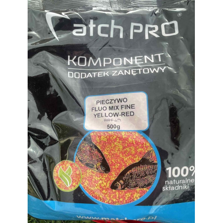 La chapelure de pain fluo Matchpro, en mélange jaune et rouge/orangé, est un additif idéal pour dynamiser vos amorces. Ses particules fines et grosses, coulantes, renforcent l’attractivité et stimulent la prise alimentaire. Adaptée à la brème, la carpe, le gardon et tous les poissons friands de farines, elle offre visibilité et diffusion optimales dans toutes les couches d’eau. Très utilisée pour la pêche au quiver, elle convient aussi à toutes les pêches de fond : grande canne, bolognaise et anglaise. Dosage recommandé : jusqu’à 15 % du volume total. Sachet de 500 g.